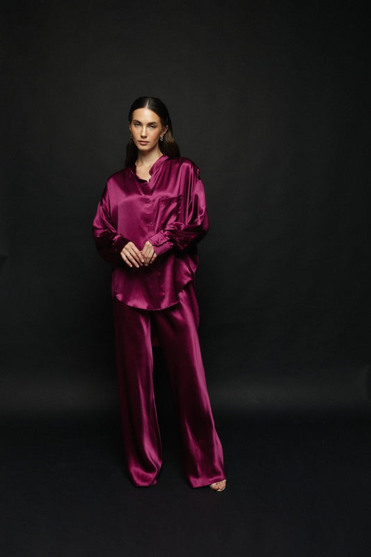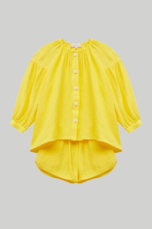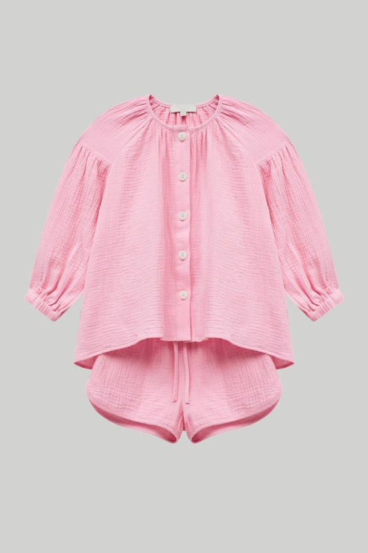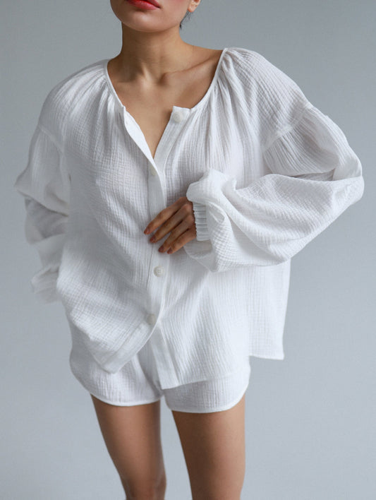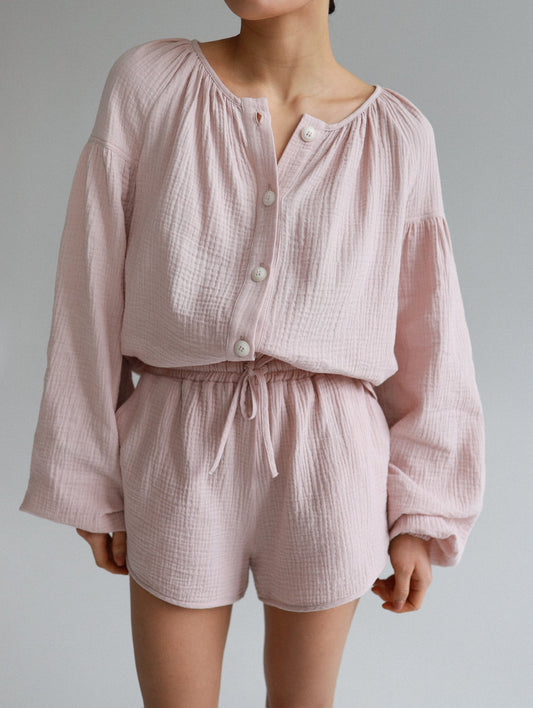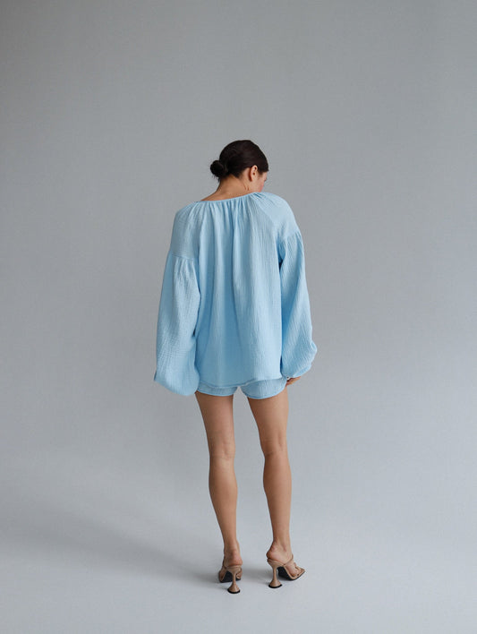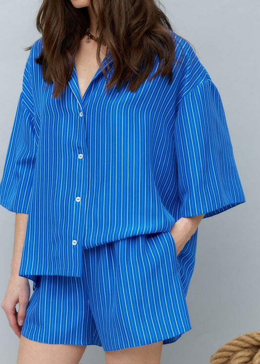 Pure Silk Blouse and Shorts Set in Blue with Stripes