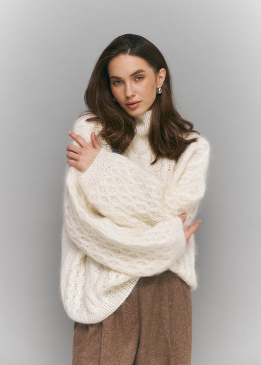 KALYNA Kid Mohair Handcrafted Cable-knit Turtleneck Sweater in White