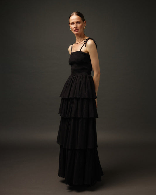 Довга бавовняна сукня з воланами на тонких бретелях "Paris" в чорному
